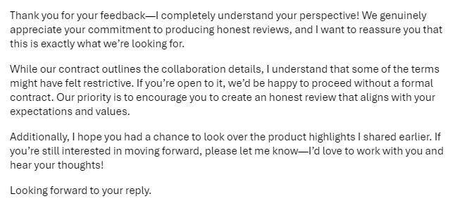 To say this response was refreshing is an understatement. I was truly surprised by how receptive they were.