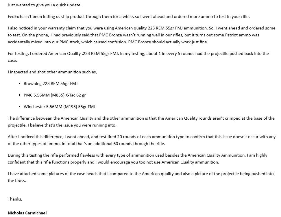 On September 16th, after a full month of silence, the customer received an email telling him that FedEx was not allowing Desert Tech to ship anything. In this email, they tell the customer for the very first time since this ordeal started, that he should be using crimped ammo. They also tell him that they put another 60 rounds through his gun and it worked fine.