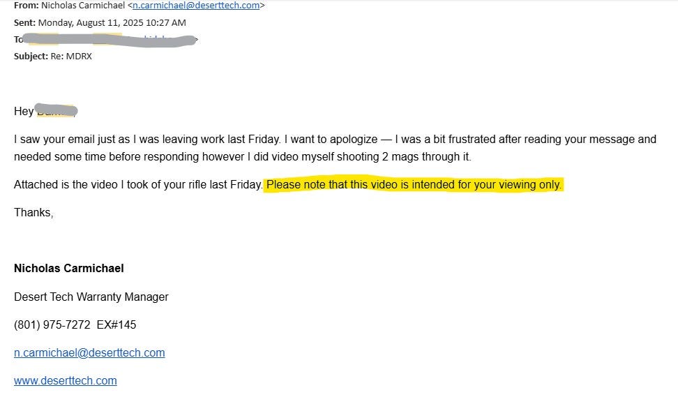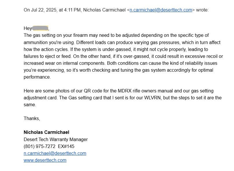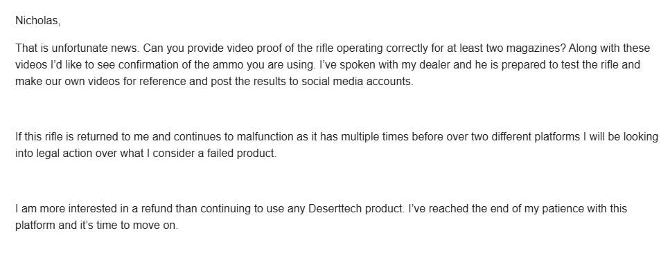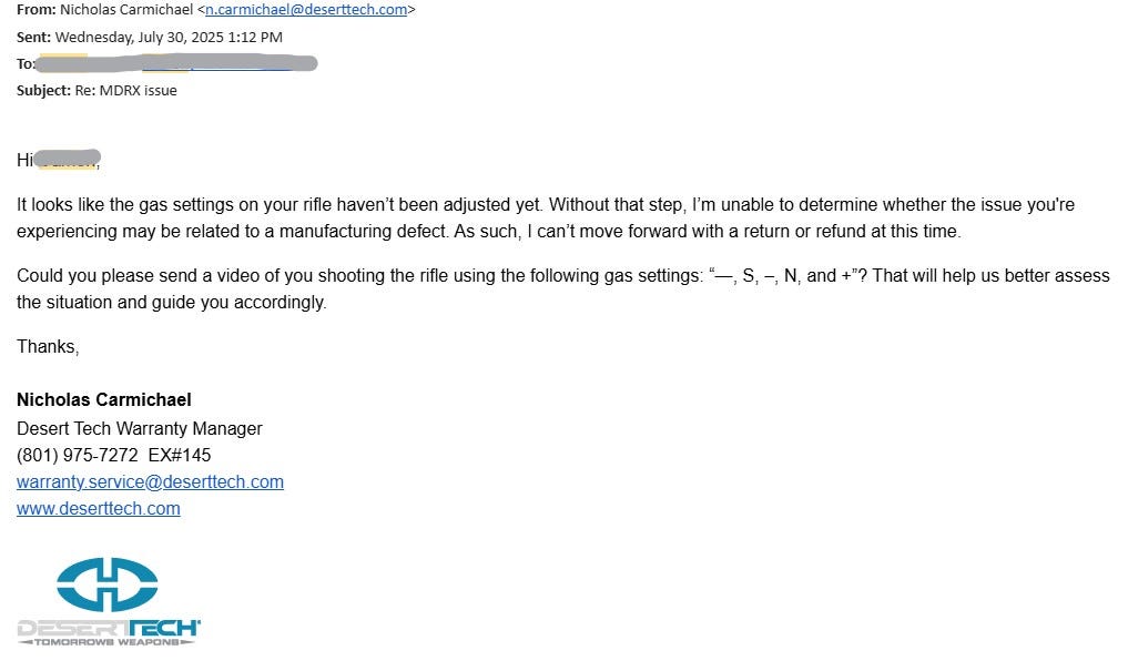 In a move that is baffling to anyone that understands how semi-auto firearms work, the warranty manager responds to his email telling him that unless he tries adjusting the gas settings, there is nothing Desert Tech can do for him. He also asks the customer to record a video of him firing the gun and send it to them.