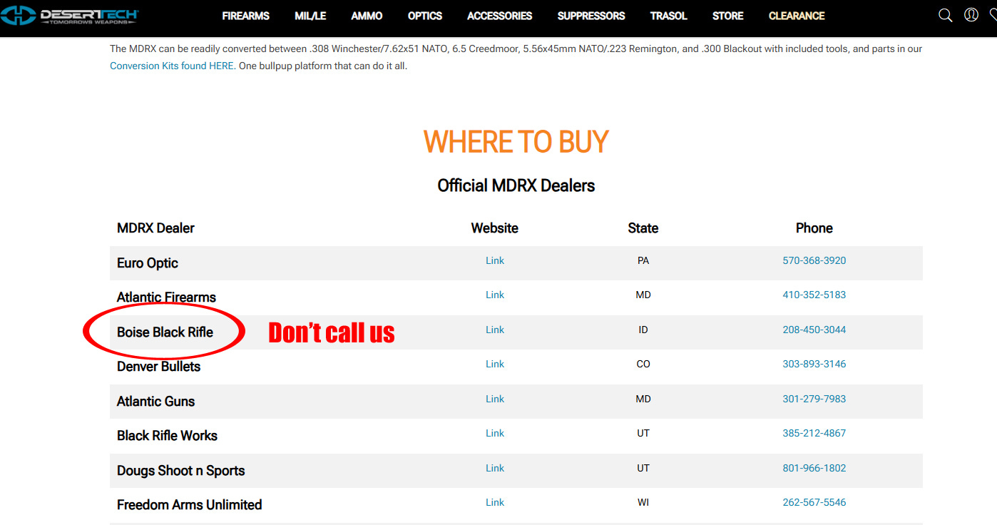 We at Boise Black Rifle have attempted multiple times to intervene with Desert Tech on the customer’s behalf, but they do not want us involved in the process. They routinely dropped us from any email responses they sent to the customer. Because of the way they have treated this customer, we have made the decision to no longer sell their products.