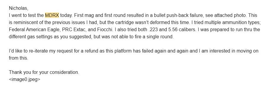 In the email response the customer received, the Warranty Manager tells the customer that it appears to be a gassing issue. The gun not chambering a round from a fresh mag by manually cycling the bolt is a gassing issue. Here is the email response he got after asking for a refund.