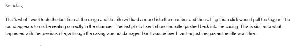 At this point, the customer is very rightfully becoming upset. He emails back reiterating that the gun will not fire a round at all, ever. He cannot adjust the gas settings as the gun is not creating any gas to adjust.