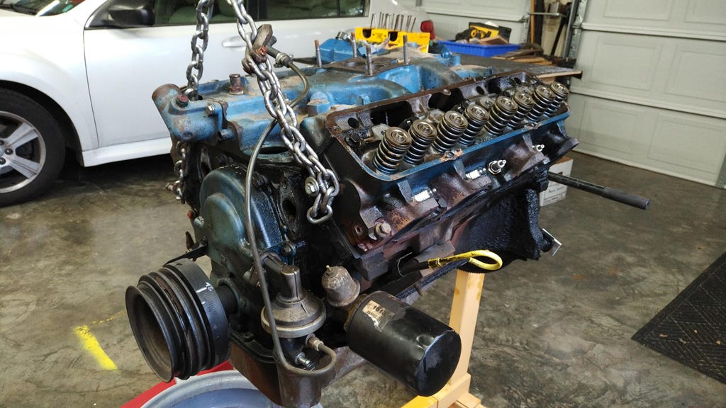 It drove great and everything was going awesome, until I left my parent's house and headed home. I got about three blocks away and the engine stumbled hard, and then died. I coasted to the side of the road where I managed to get it restarted, but it would barely run. I limped it back to my parents house where I parked it and started to try and figure out what was going on. Once I got out and stuck my head under the hood, I could hear very bad noises coming from the passenger side cylinder head area. At this point, I closed the hood and walked away lest I start beating it with a hammer.