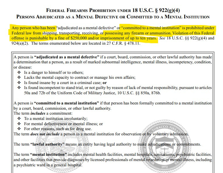 Federal law 18 USC ยง922(g)(4) prohibits someone who was committed to a mental institution from possessing a firearm or ammunition. Violation of that section is a federal felony.